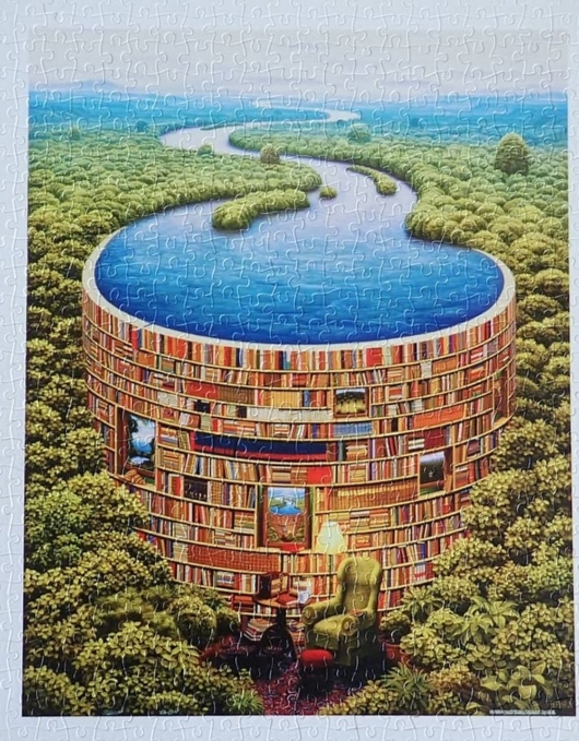 Фантазийный мир польского художника-иллюстратора Яцека Йерки не поддается рациональному объяснению, и этим он особенно прекрасен. Только скажите: где еще библиотека будет напоминать сверху донизу наполненный водой колодец, куда стекаются притоки рек, готовые вот-вот выйти из берегов? Конечно же, на картинах Йерки! Воспользуйтесь отличной возможностью собрать одну из репродукций этого талантливого художника, и вы сможете хотя бы попытаться понять, что именно мастер вложил в её название ("Библиотека").