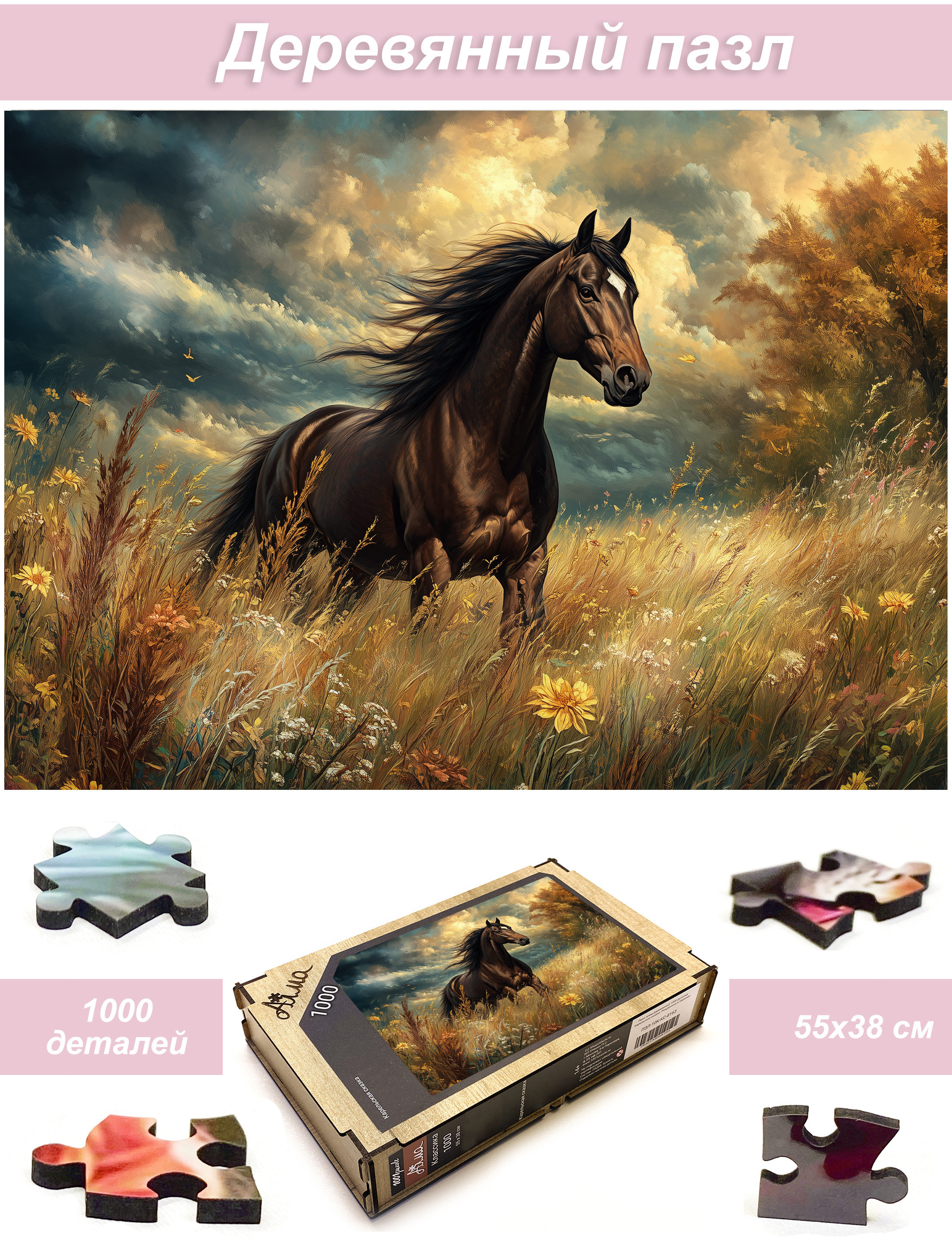 Пазл Алма деревянный 1000 деталей. Лошади. Ветер степей