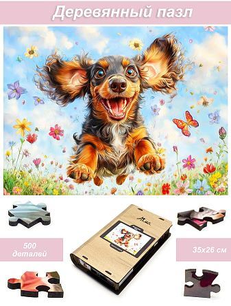 Пазл Алма деревянный 500 деталей. Пушистые создания. Веселый полет таксы
