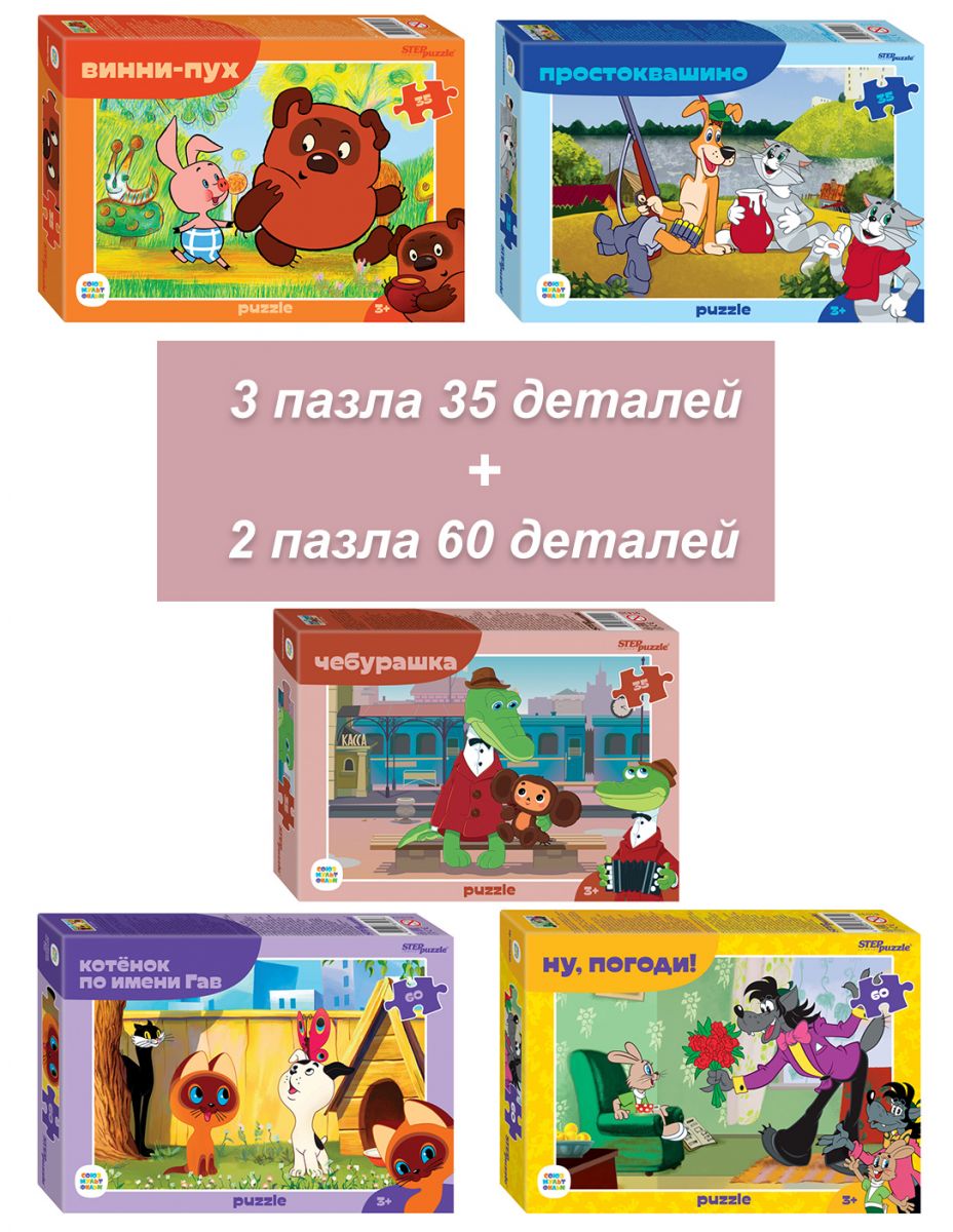 Герои мультфильмов Союзмультфильм: Чебурашка, Котёнок по имени Гав, Ну, погоди!, Простоквашино, Винни-Пух. Размер пазлов 23x33 см.