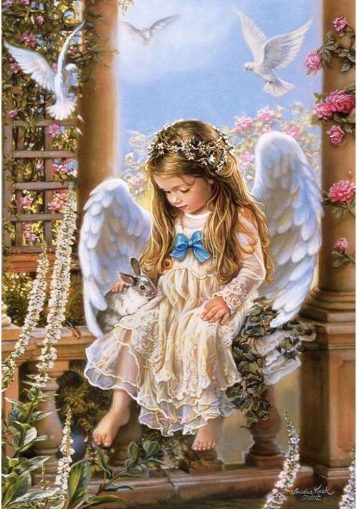 Нежная любовь  - это пазл с изображением маленькой девочки-ангелочка, гладящей кролика.
