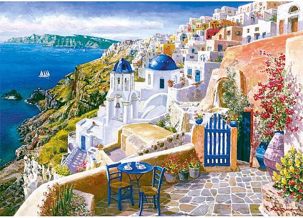 Вид с Санторини - прекрасный пейзаж с одного из вулканических склонов на острове Тира. Прекрасный выбор как для любителей пазлов, так и для тех, кто ищет оригинальное дополнение к домашнему интерьеру.