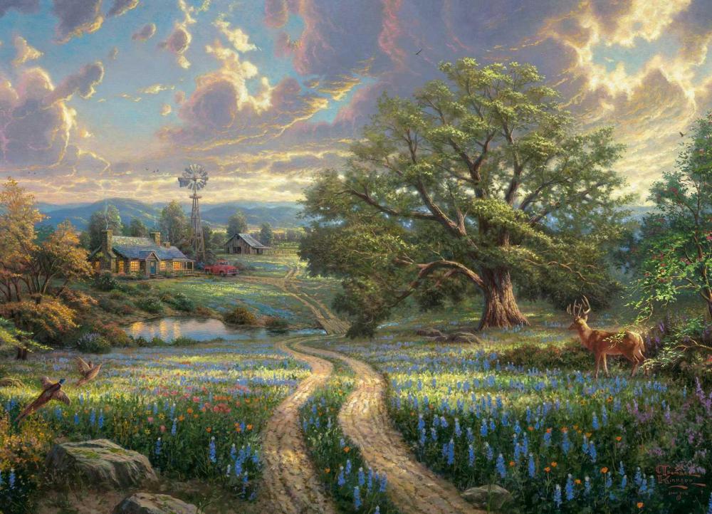 Проселочная дорого через поляны, ведущая к очаровательному загородному домику. Олень, вышедший посмотреть - кто это тут идет? Спокойствие, умиротворение и тишина - то, чего не хватает многим после суеты городов. Это картина работы Томаса Кинкейда, знаменитого своими пейзажами художника , который уже давно стал известен как "художник света" или "самого коллекционируемый художник США".