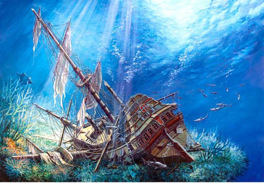 Сквозь толщу воды пробиваются лучи солнца, освещая затонувший корабль. Стайки рыб заинтересованно проплывают мимо, обрывки парусов колышатся в волнах. Может быть, там запрятаны сокровища?