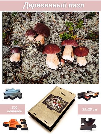 Деревянный фигурный пазл бренда 1001puzzle - уникальная настольная игра, прекрасный подарок для взрослых и для детей. Деревянная головоломка с нестандартной нарезкой состоит из 500 ярких фигурных деталей. Каждый элемент пазла - уникален, что делает сборку еще увлекательнее. Пазлы из дерева отличаются от обычных картонных надежностью и долговечностью. Кроме того, они станут прекрасным украшением интерьера, будет радовать не только в момент сборки, но и после. В нашем ассортименте есть и яркие, веселые пазлы, есть и имитация картин, пейзажи, домашние и дикие животные. Можно подобрать рисунок на любой вкус. Пазл упакован в уникальную коробку - она же служит местом для сборки, а, при желании, вы можете использовать планшет для сборки как рамку, чтобы закрепить картину и повесить ее на стену. Все пазлы мы упаковываем дополнительно в надежную транспортировочную коробку и, очень надеемся, что она поможет пережить нашему товару сложную дорогу к вам. Серию "Карельская сказка" мы посветили этому чудесному краю, в который невозможно не влюбиться с первого раза. В этих фотографиях - душа севера: безмолвная гладь озер, отражающих небо, бескрайние хвойные леса, хранящие вековую тишину, и особая магия — тихая охота. Здесь, в мхах под соснами, прячется царь гриб — боровик, главный трофей для тех, кто понимает язык леса. Бескрайние озера, сосновые боры, скалы.. Рай для грибников - боровики и подосиновики, лисички и грузди как будто сами запрыгивают в корзинку. А ягоды - наслаждение вкусом, кладезь витаминов, что может быть прекраснее черники или брусники в сосновом лесу?
