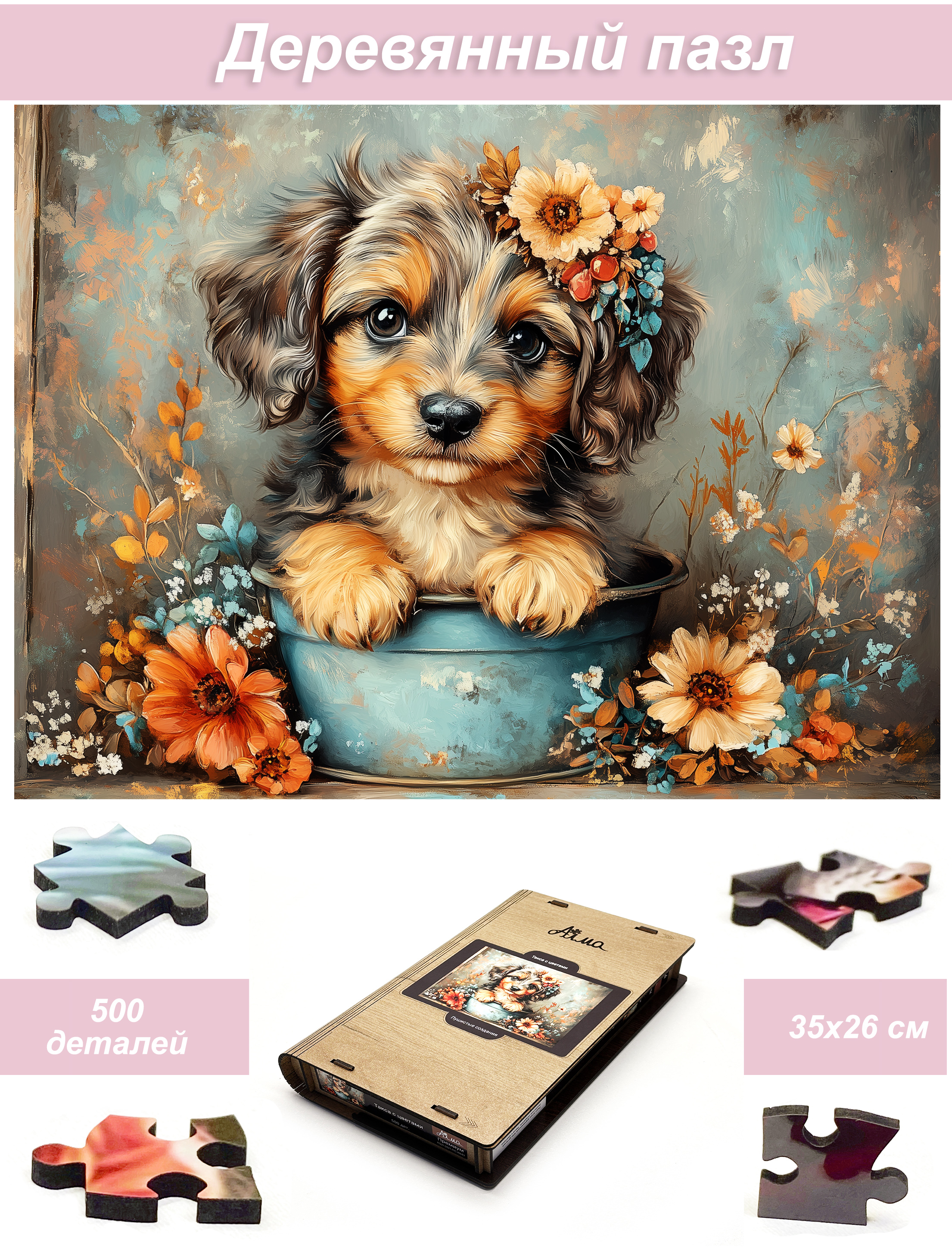 Пазл Алма деревянный 500 деталей. Пушистые создания. Такса с цветами