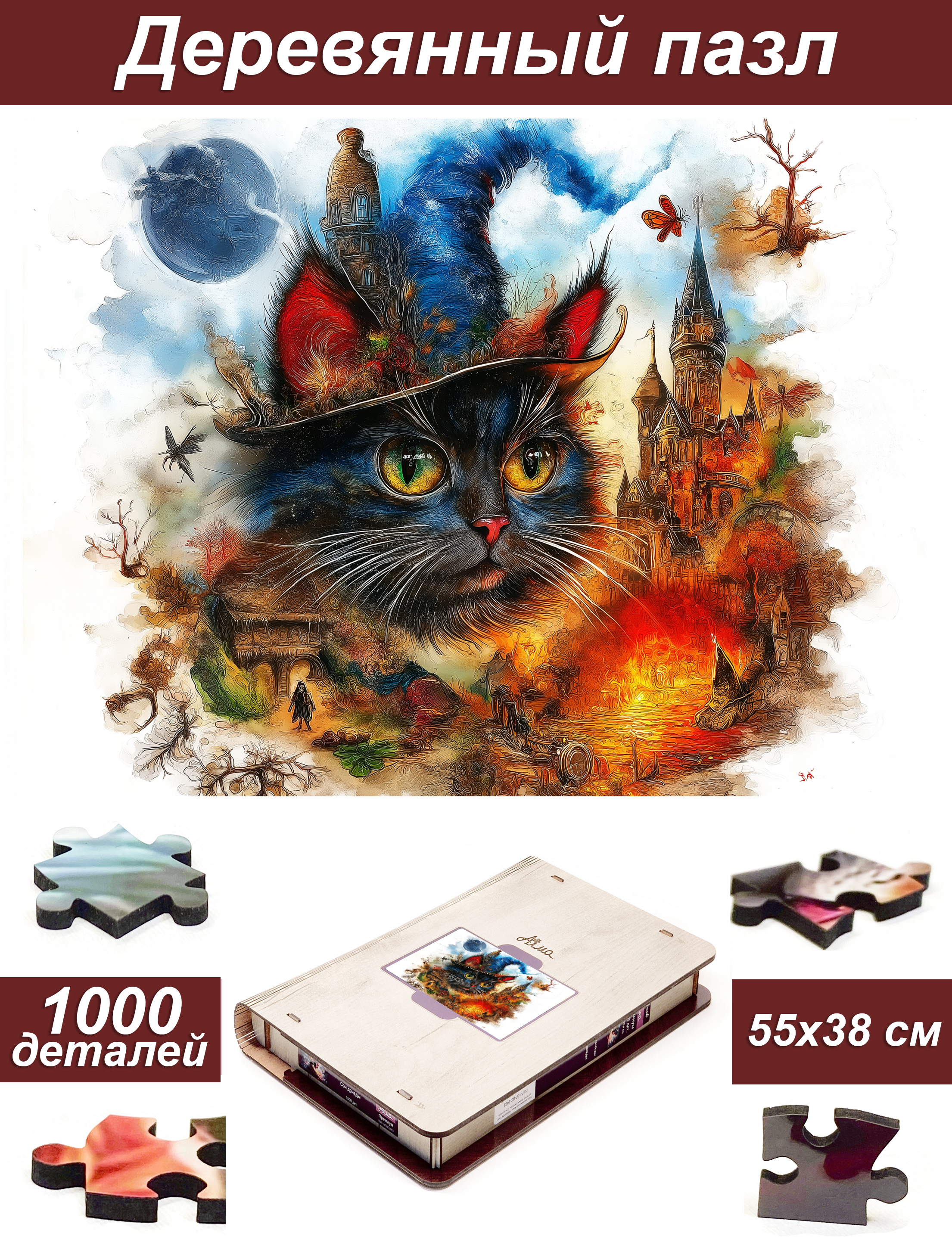 Пазл Алма деревянный ПРЕМИУМ 1000 деталей. Пушистые создания. Магия кота