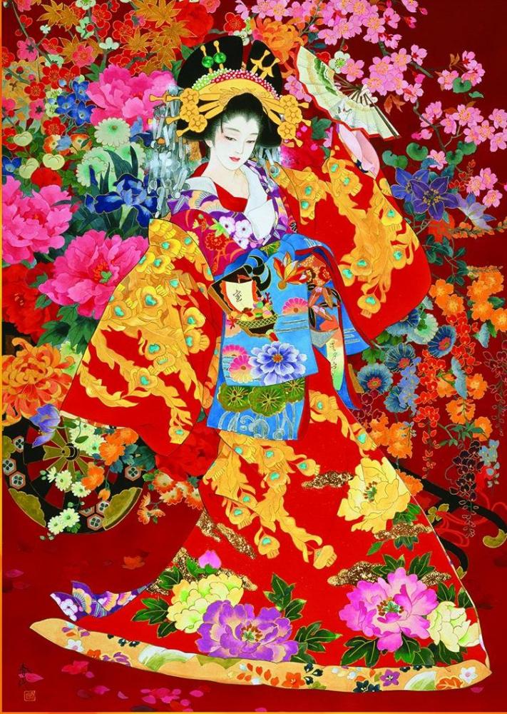 Японская художница Харуё Морита погружает нас в удивительный мир азиатской культуры, репродукция дает возможность насладиться образами гейш и знатных дам, ярких цветов и деревьев.