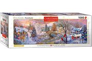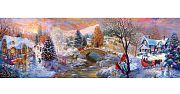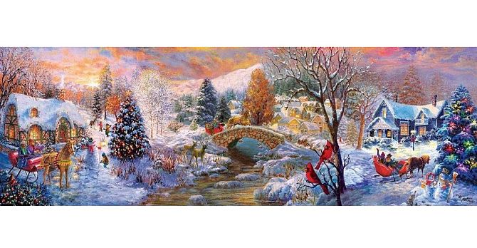Новый год, Рождество, очаровательная деревня под покровом снега, украшенная елка. Закат и теплый свет в окошках домиков. Очень добрый и душевный пазл, а формат панорамы очень эффектно смотрится в интерьере.