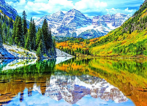 Озеро в горах, отражение снежных вершин, склоны гор, покрытые деревьями, уже начинающими становиться оранжевыми. Абсолютно ровная поверхость прозрачной воды и звенящая тишина.