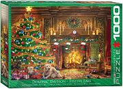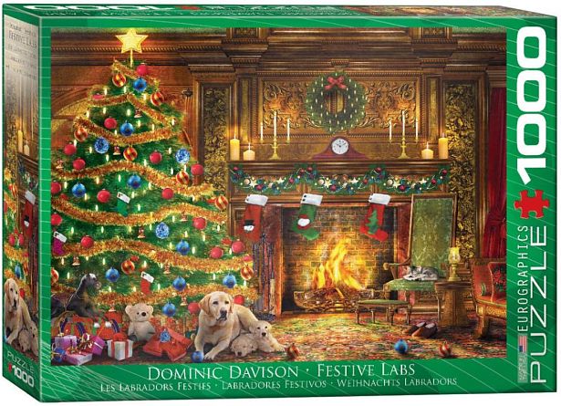 Уютная новогодняя картина с камином, огромной елкой, отдыхающими собаками, лабрадорами и спящей на кресле кошкой. Можно собирать всей семьей перед новым годом и мечтать о празднике, можно жарким летом - и так же мечтать.