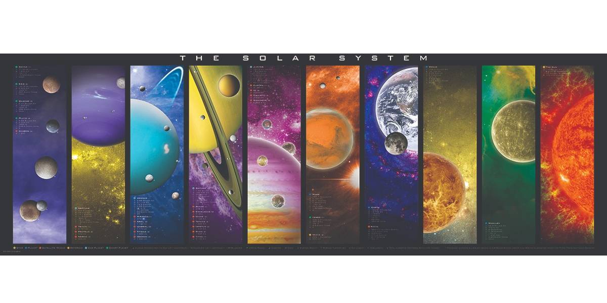 Панорамный пазл со всеми планетами солнечной системы и их характеристиками (правда, на английском). Зато, собрав данное изображение - выучим навсегда, как выглядит каждая планета, а готовый результат будет отлично смотреться на стене.