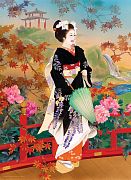 Репродукция картины японской художницы, прекрасная девушка, яркие розовые цветы, кленовые листья, водопад.
